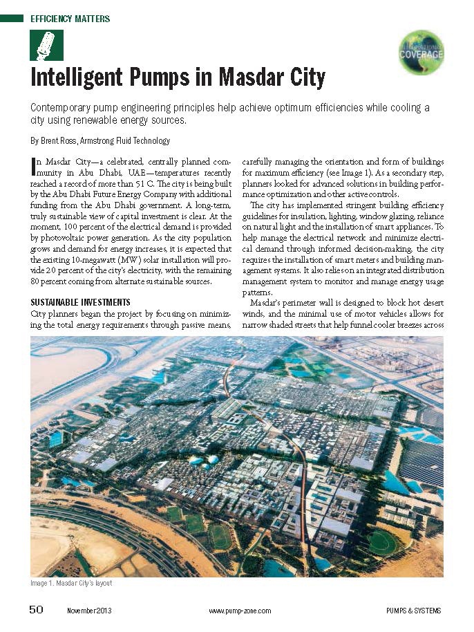 If someone needs a big truck for 15 days each year and a small car for the other 350 days of the year, it is not an optimal solution to buy a big truck. So Armstrong Fluid Technology employed only intelligent, pre-packaged fluid management equipment and worked with engineers to initiate design planning for the use of demand-based control in Masdar. Demand-based control is a system optimization method for HVAC systems.