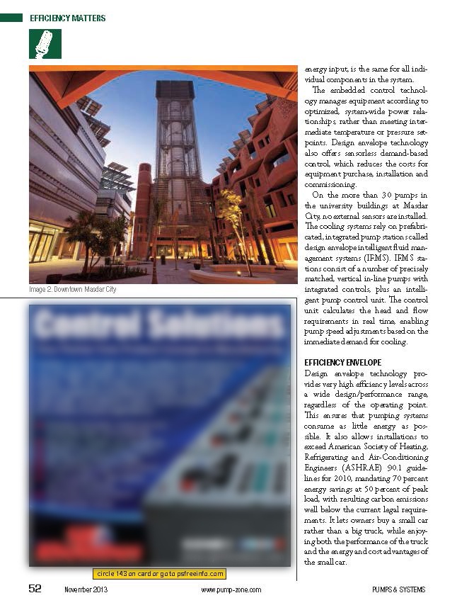 On the more than 30 pumps in the university buildings at Masdar City, no external sensors are installed. The cooling systems rely on prefabricated, integrated pump stations called Design Envelope Intelligent Fluid Management systems (iFMS). iFMS stations consist of a number of precisely matched, vertical in-line pumps with integrated controls, plus an intelligent pump control unit. The control unit calculates the head and flow requirements in real time, enabling pump speed adjustments based on the immediate demand for cooling.