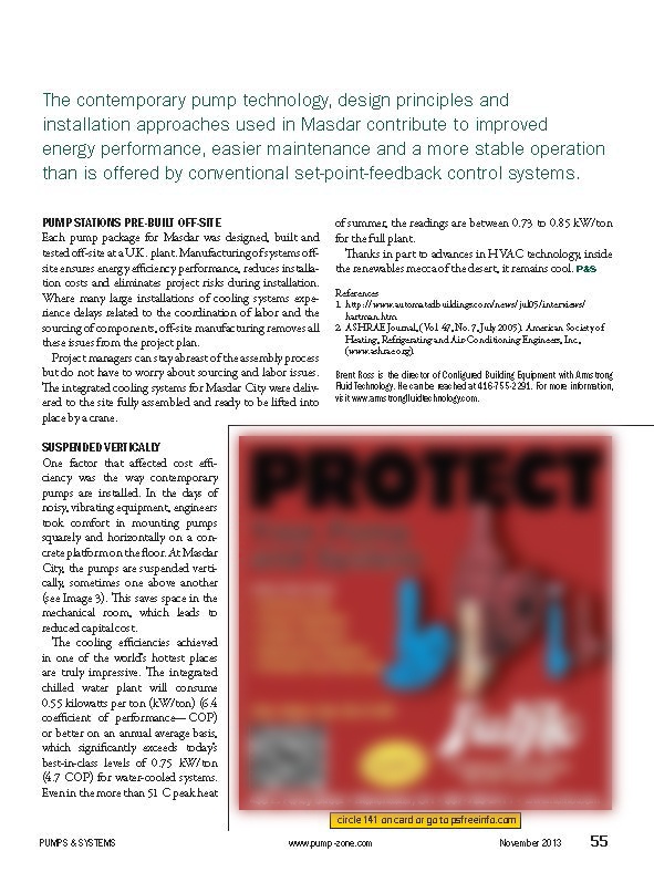 In many instances, although building specifications might change, redesign or re-selection of the Design Envelope pumps will not be required. Even after installation, the wider performance capabilities of integrated, Design Envelope technology can accommodate variations in cooling requirements. New or revised requirements may stem from increased occupant density, changes to building use or modifications in the shade conditions because of changes in the building’s surroundings—such as the construction of new buildings adjacent to the existing site. This operating flexibility is significant on large projects such as Masdar City, which is expected to require an additional 50,000 tons of district cooling during the next five years. For the city’s project managers, the broader operating range of the pump systems will provide greater adaptability without costly HVAC refurbishment, while ensuring continued optimization of pump efficiency.