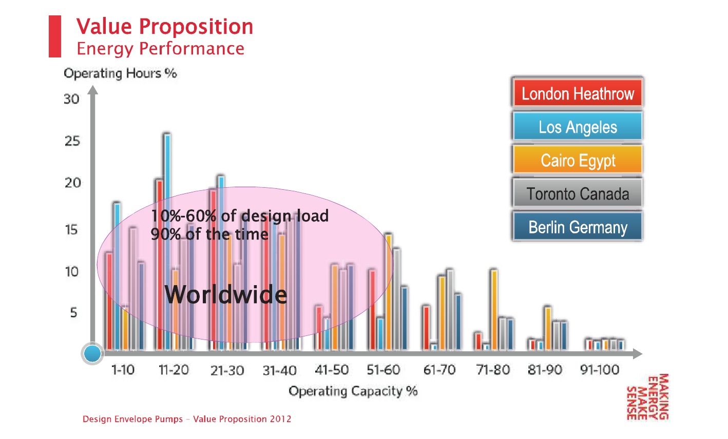 The traditional approach to designing HVAC systems in the past was to use components, such as pumps, chillers or booster sets, which operate at a fixed speed. HVAC systems around the world, however, are at their most efficient if designed for part-load. Whether the demand is for heating or cooling, the same pattern of usage applies. For 90% of the time, throughout their lifetimes, systems operate at between 10% and 60% of their design load (see Figure 1). Despite this fact, many HVAC systems installed in the UK still incorporate components operating at 100% of design load for 100% of the time. This results in wasted money, shortened equipment lifecycles and unnecessary carbon emissions. Replacing fixed speed plant with variable speed equipment (which is more efficient at part load) can be the key to significant energy and cost savings.